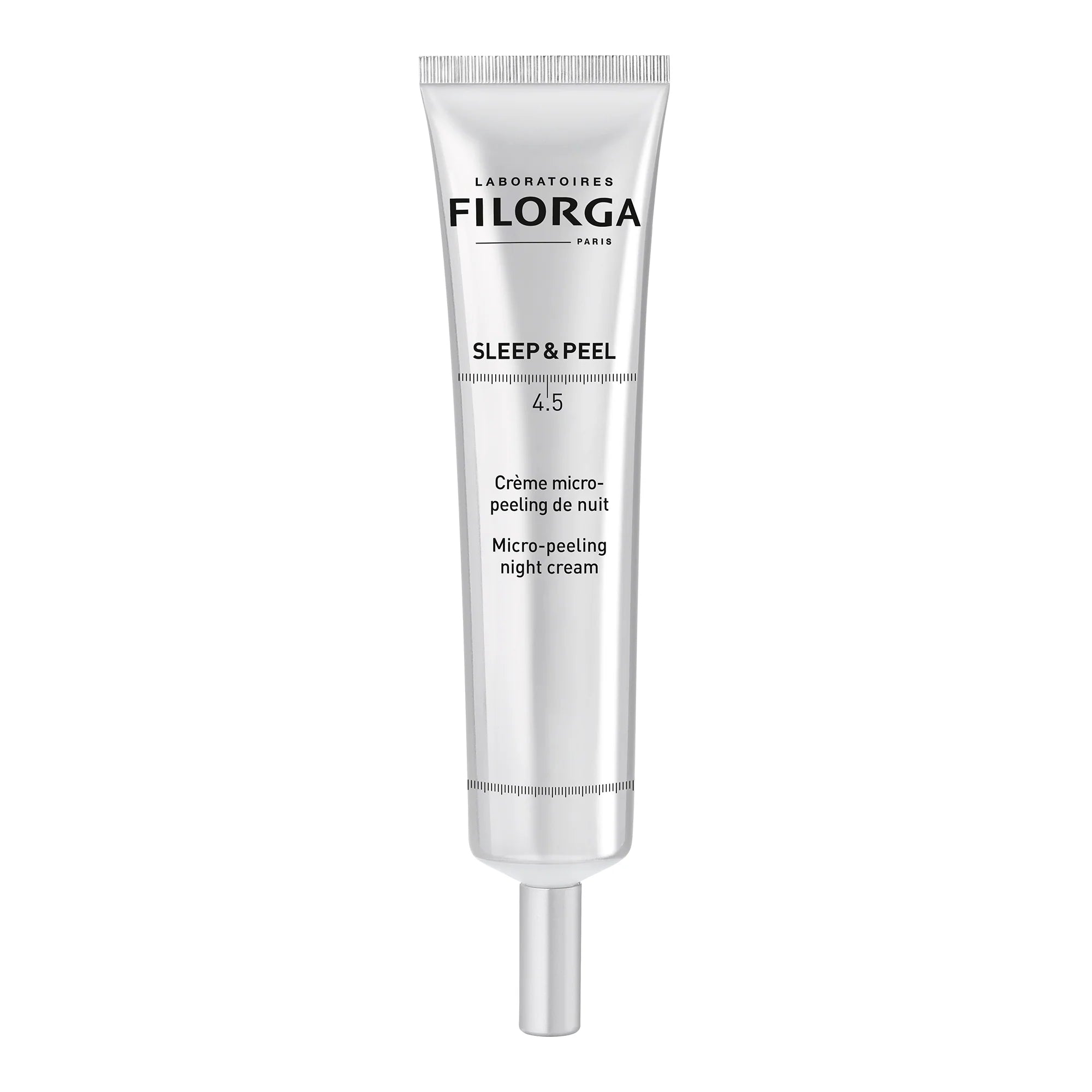 Filorga Sleep&Peel 4.5 is a nighttime resurfacing cream inspired by professional peeling treatments. With a concentration of 4.5% exfoliating acids (AHA + BHA + PHA), it gently stimulates skin renewal, smooths fine lines, refines texture, and boosts radiance overnight. Its creamy texture works while you sleep to reveal fresher, softer, and more luminous skin every morning—without irritation.