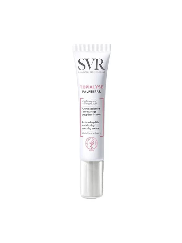 Soothe, repair, and protect severely dry, irritated, and sensitive eyelids and eye contours with SVR TOPIALYSE PALPEBRAL CRÈME - 15ML. This specialized cream is expertly formulated to provide immediate comfort and long-lasting relief from itching, redness, and discomfort around the eyes. Its highly tolerant formula features a concentrated blend of nourishing and soothing active ingredients, including Omega 3, 6, 9 and Glycyrrhetinic Acid, to calm irritation, replenish lipids, and restore the delicate skin barrier. The ultra-creamy, yet non-greasy texture absorbs quickly, forming a protective barrier that helps to reduce sensitivity and protect against external aggressors. Ideal for daily use, it visibly reduces signs of irritation for a calmer, more comfortable eye area.